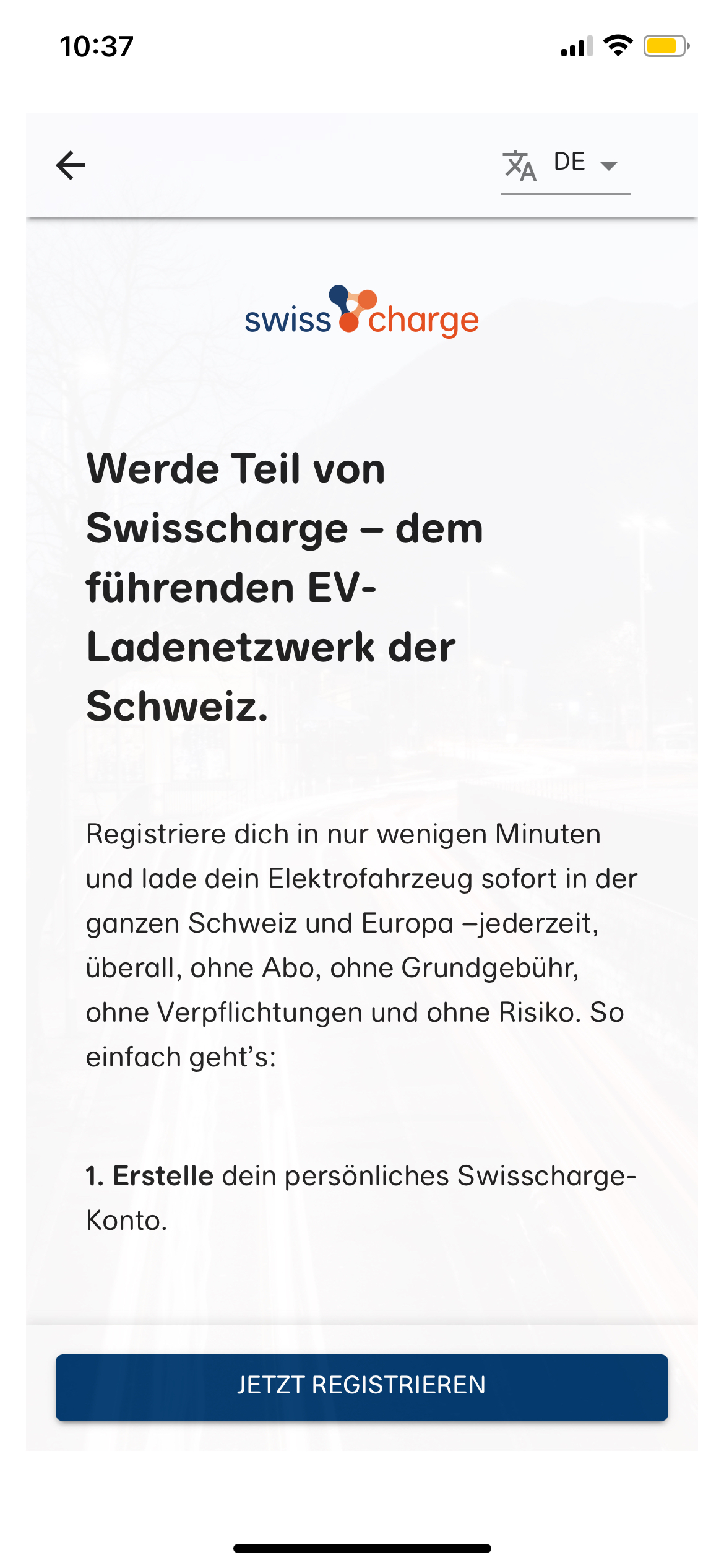 To register with Swisscharge, click either on this link to the homepage or register via the swisscharge app.